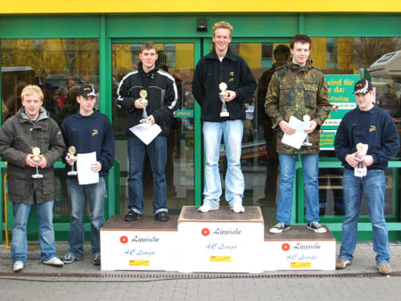 sehr gut entwickelt haben. In der Gruppe A der 16-18jährigen Youngster, in der noch kein Auto-Führerschein erforderlich ist, gingen bei 20 Startern allein 4 der 6 ausgegebenen Pokale an die „Rookies“. Trotz Pylonenpech (jeweils 3 Strafsekunden) ergatterten Nico Möller vom AMC Retzen sowie der Rietberger Jens Rötter durch schnelle Laufzeiten noch die Pokalränge 5 und 6. Mit ähnlich guten Zeiten, jedoch fehlerfrei, reichte es für zwei Neueinsteiger sogar auf's Treppchen: Platz 2 für den Bielefelder David Paluch und Platz 3 für Sebastian Marschalt vom AC Höxter.Eingerahmt von diesen 4 schnellen Neueinsteigern lief der Lagenser Felix Berkenkamp auf Pokalrang 4 ein, und das bei seinem altersbedingt letzten Start in der Gruppe A. Ein weiterer Lagenser durfte bei der Siegerehrung den obersten Platz auf dem Siegerpodest erklimmen: Spiel, Satz und Sieg für Matthias „Matze“ Althoff vom AMC Retzen. Nach zwei Lehrjahren im Cup konnte er nun endlich an seine erfolgreiche Kart-Karriere anknüpfen und sich die Jahreswertung des ADAC-OWL ebenso sichern wie die Sonderwertung der „Lippischen“. Erfreulich auch, daß mit